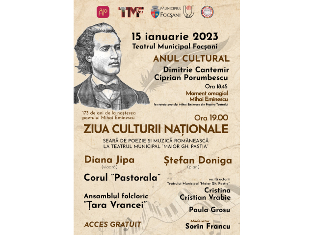 Evenimentele culturale vor avea loc pe 15 ianuarie 2023 la Teatrul Municipal "Maior Gh. Pastia". Manifestările vor începe cu evocarea personalității poetului Mihai Eminescu, de la ora 18.45, la bustul acestuia din Piațeta Teatru, unde se va depune și o coroană de flori!