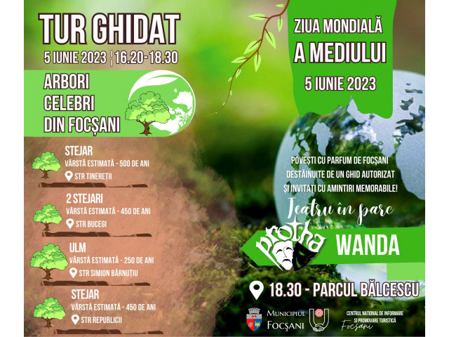 Pe 5 iunie este celebrată "Ziua Mondială a Mediului Înconjurător", prilej pentru a vă invita la un nou tur ghidat organizat de Primărie prin Centrul Național de Informare și Promovare Turistică Focșani al cărui scop este acela de a promova arborii seculari din Municipiul Focșani dar și poveștile acestora.