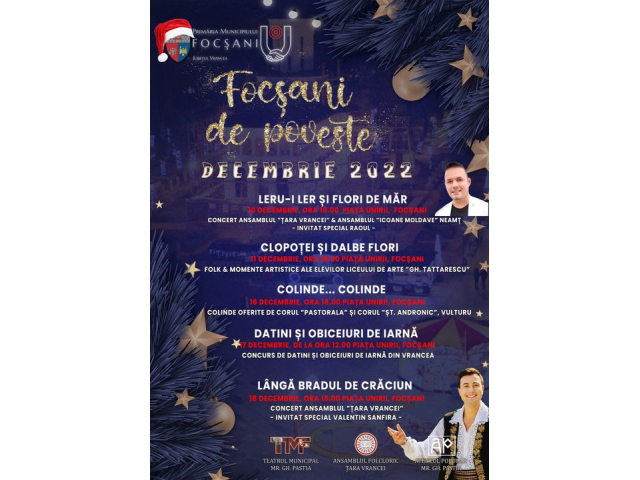 Primăria Municipiului Focșani, împreună cu Teatrul Municipal „Maior Gheorghe Pastia" Focșani, Ateneul Popular „Maior Gheorghe Pastia" Focșani și Ansamblul Folcloric "Țara Vrancei", are deosebita plăcere să invite toți focșănenii în Piața Unirii la o serie de concerte cu ocazia Sărbătorilor de Iarnă.