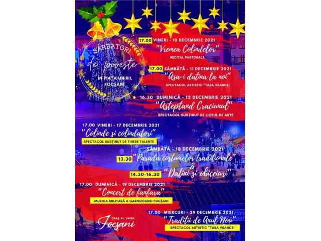 -Sâmbătă, 11 decembrie - ora 17.00, "Așa-i datina la noi", spectacol oferit de Ansamblul Folcloric "Țara Vrancei";
