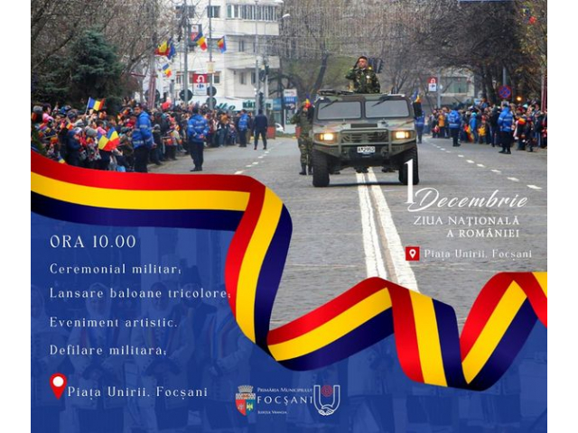 Întregul eveniment, care cuprinde activitatea Garnizoanei Focșani, alocuțiunile autorităților, alături de momentul artistic, precum și lansarea baloanelor colorate în tricolor care vor umple cerul, va da fiecărui focșănean ocazia de a fi, o dată în plus, mândru că este român!