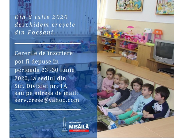 Cererile de înscriere pot fi depuse în perioada 23 -30 iunie 2020, la sediul din Str. Diviziei nr. 1A sau pe adresa de mail - serv.crese@yahoo.com.