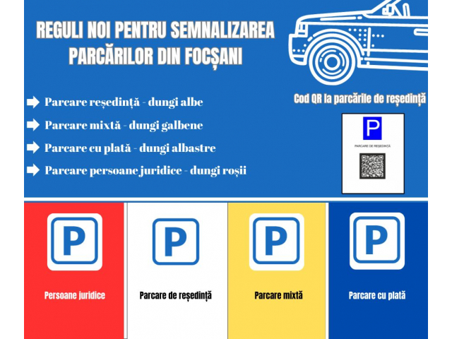 Noul sistem de semnalizare a parcărilor din Municipiul Focșani a fost aprobat în noiembrie 2022 printr-o hotărâre a Consiliului Local care a modificat Regulamentul de organizare și funcționare a serviciului public de administrare, întreținere și exploatare a parcărilor ce aparțin domeniului public și privat al Municipiului Focșani.