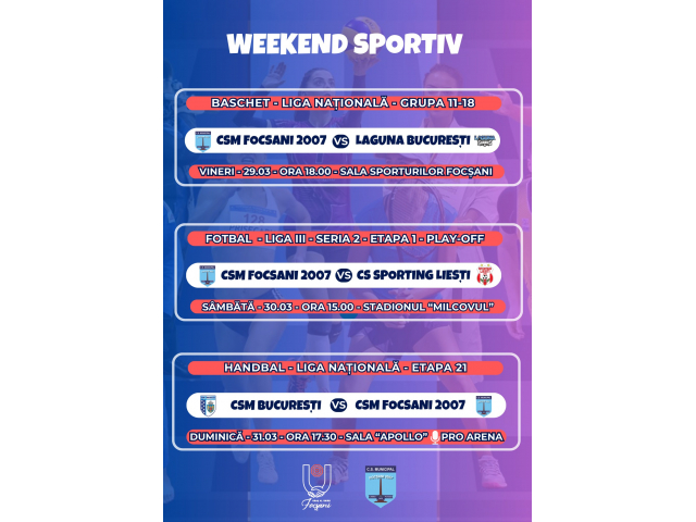 Vineri, echipa de baschet a CSM Focșani 2007 va juca un meci important în etapa a 26-a a Ligii Naționale. De la ora 18.00, în Sala Sporturilor Focșani, echipa noastră va primi vizita formației de pe penultimul loc din Grupa 11-18, ABC Laguna București.