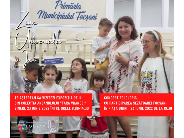 Vineri, 23 iunie 2023, Primăria Municipiului Focșani vă invită să vizitați holul instituției, unde va fi organizată o expoziție cu ii din colecția Ansamblului Folcloric "Țara Vrancei"!
