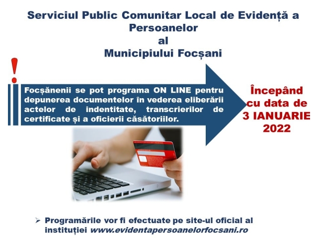 Serviciul Public Comunitar Local de Evidență a Persoanelor al Municipiului Focșani anunță în mod public faptul că, începând cu data de 3 ianuarie 2022, toate persoanele interesate se pot programa ON LINE pentru depunerea documentelor în vederea eliberării actelor de indentitate, transcrierilor de certificate și a oficierii căsătoriilor.