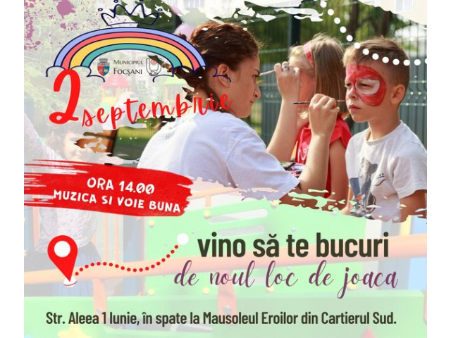 De la ora 14.00, vă așteptăm la locul de joacă din Str. Aleea 1 Iunie, în spate la Mausoleul Eroilor din Cartierul Sud, pentru a ne distra și juca împreună!