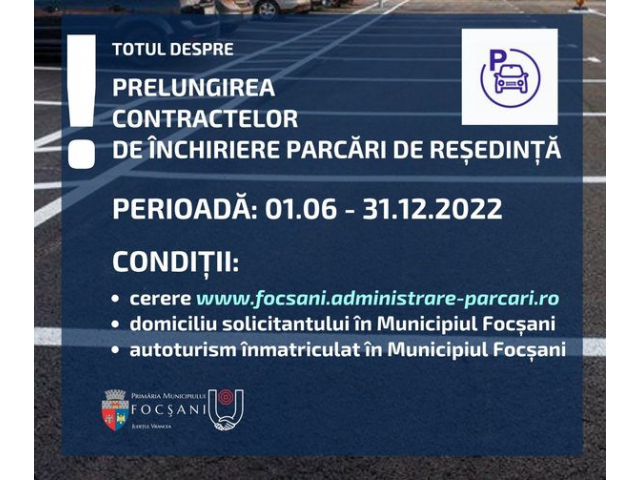 Direcția de Dezvoltare Servicii Publice (DDSP) Focșani anunță în mod public faptul că la 1 iunie 2022 va începe campania de depunere a cererilor pentru prelungirea contractelor de închiriere a locurilor de parcare din Municipiul Focșani. Astfel, fiecare dintre actualii titulari își poate exprima dreptul de preempțiune până la data de 31 octombrie 2022.