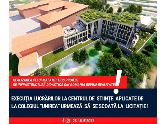 Practic, ca urmare a implicării Ministrului Dezvoltării, Compania Națională de Investiții (CNI) urmează să organizeze, în curând, licitația, pentru demararea lucrărilor la Centrul de Științe Aplicate de la Colegiul Național Unirea (CNU) Focșani, probabil, cel mai ambițios proiect de infrastructură didactică din România!