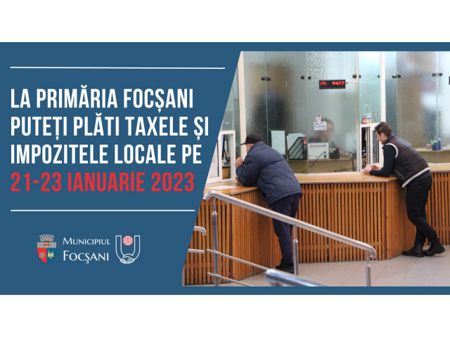 Funcționarii de la Registratura taxe şi impozite vor sta la dispoziția focșănenilor pe data de 23 ianuarie 2023, între orele 08:00-16:00 .