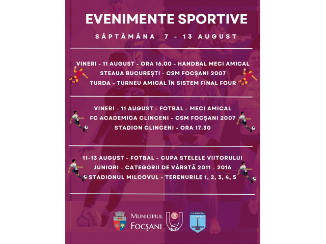 Duminică, pe terenurile 1, 2, 3, 4 și 5 ale stadionului Milcovul va avea loc "Cupa Stelele Viitorului" Focșani, o competiție interesantă de fotbal juvenil la care participă echipe de fotbal din România la categoriile de vârstă 2011, 2012, 2013, 2014, 2015 și 2016.