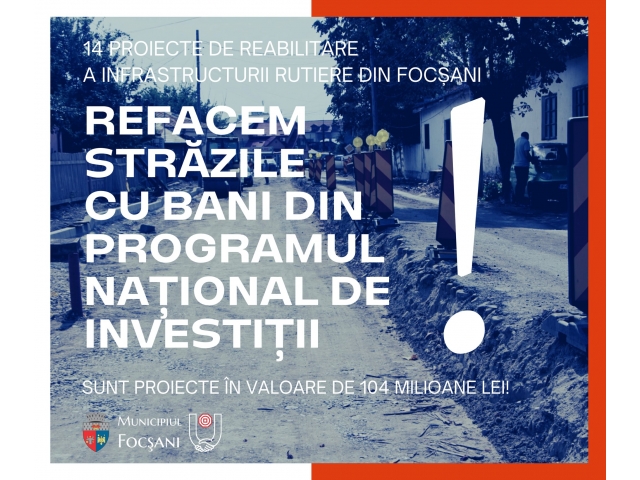 -Refacere infrastructură străzi, sistematizare verticală str. Timiș, str. Nicolae Bălcescu, str. Predeal (tronson cuPrimăria Municipiului Focșani a depus un număr de 14 cereri de finanțare, în valoare de aproximativ 104 milioane lei în cadrul Programului Național de Investiții "Anghel Saligny".