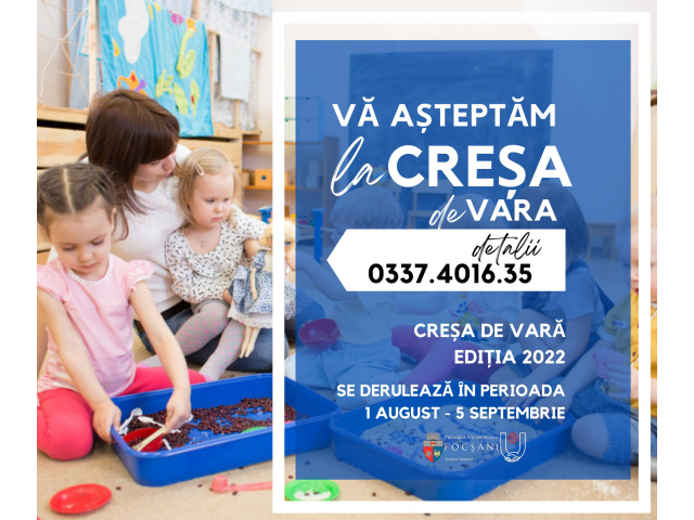 În perioada 01 august - 05 septembrie 2022, Primăria Municipiului Focșani, alături de Serviciul Public Creșe susține programul "Creșa de vară".