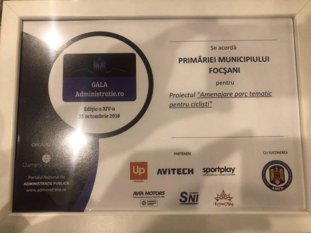 Dupa ce în 2017 ne-a fost acordat premiul pentru proiectul "Reabilitarea sistemului de termoficare urbană la nivelul Municipiului Focșani pentru perioada 2009-2028 în scopul conformării la legislația de mediu și creșterii eficienței energetice", în acest an Primăria Municipiului Focșani a primit premiul pentru proiectul „Amenajare parc tematic pentru cicliști".