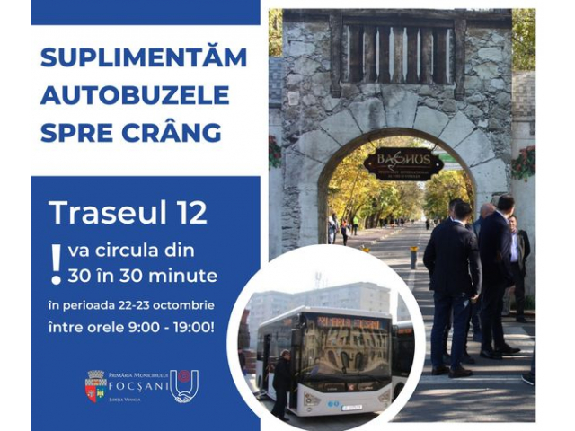 Sâmbătă, 22 octombrie și duminică, 23 octombrie autobuzele vor pleca din Sud, pe traseul 12, o data la 30 de minute, în intervalul 9.00-19.00!