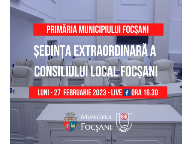 Proiectul ordinii de zi al ședinței extraordinare a Consiliului local al municipiului Focșani ce va avea loc astăzi, 27 februarie 2023, ora 16,30, ședință ce se va desfășura cu participarea fizică a consilierilor locali, la sediul Primăriei municipiului Focșani din Bdul. Dimitrie Cantemir nr. 1 bis.