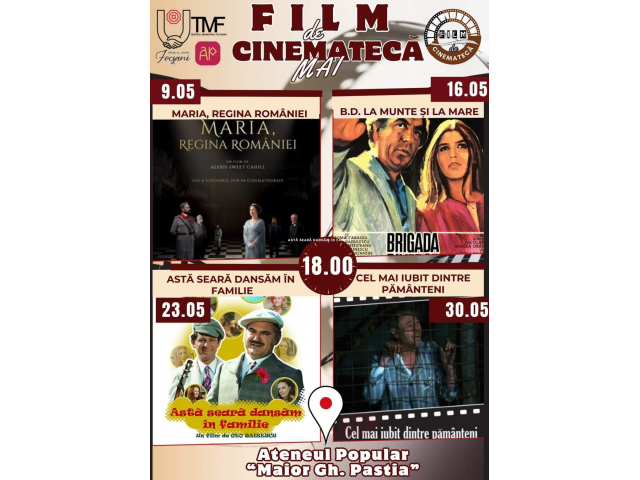 Așa cum v-am obișnuit deja, Primăria Municipiului Focșani, prin Centrul Național de Informare și Promovare Turistică Focșani, alături de Teatrul Municipal "Maior Gh. Pastia", organizează la Ateneul Popular "Maior Gh. Pastia" proiectul cultural "Film de Cinematecă".