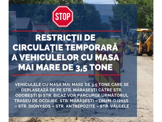 Vehiculele cu masa mai mare de 3,5 tone care se deplasează de pe str. Mărășești către str. Odobești și str. Bicaz vor parcurge următorul traseu de ocolire: str. Mărășești - DN2M-DJ205S - str. Dionysos - str.A ntrepozite - str. Vâlcele.