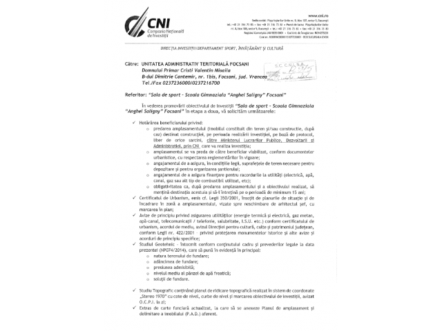 O veste bună pentru elevii de la Școala Gimnazială "Anghel Saligny" Focșani unde Compania Națională de Investiții urmează să promoveze obiectul de investiții "Sală de sport - Școala Gimnazială Anghel Saligny Focșani".