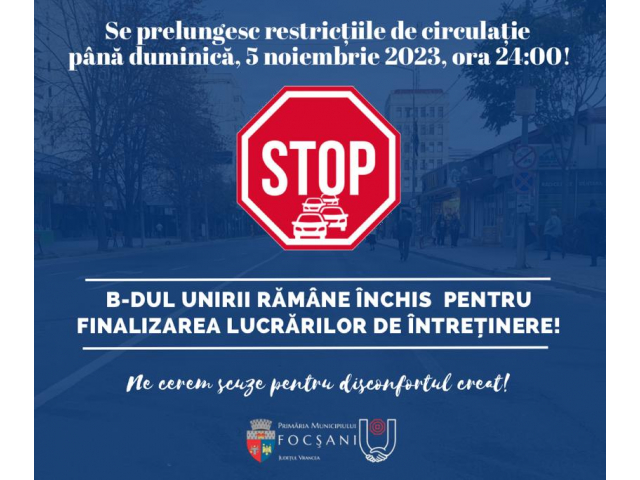 Astfel, Bulevardul Unirii va fi închis în zona Pieței Unirii până duminică, 5 noiembrie 2023, ora 24.00.