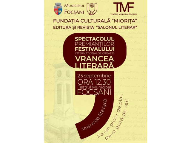 Vineri, 23 septembrie, începând cu orele 12.30, Teatrul Municipal "Maior Gh. Pastia" Focșani va fi gazda "Spectacolului premianților festivalului internațional de creație Vrancea literară", festival al cărui director este scriitorul Culiță-Ioan Ușurelu.