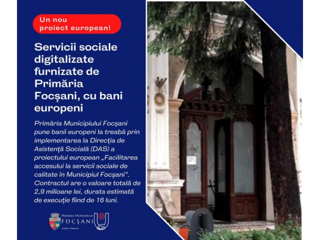 Primăria Municipiului Focșani pune banii europeni la treabă prin implementarea la Direcţia de Asistenţă Socială (DAS) a proiectului european „Facilitarea accesului la servicii sociale de calitate ȋn Municipiul Focşani". Contractul are o valoare totală de 2.995.111 lei, durata estimată de execuţie fiind de 16 luni.