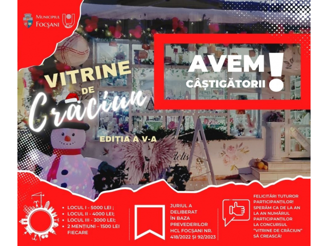Concursul "Vitrine de Crăciun", ediția a V-a, care s-a adresat operatorilor economici din Municipiul Focșani, a ajuns la ultima etapă - anunțarea câștigătorilor.