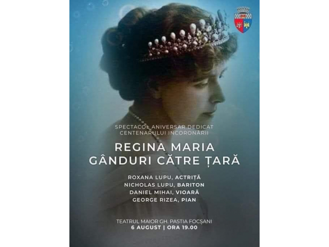 Astăzi, 6 august 2023, de la ora 19.00, la Teatrul Municipal "Maior Gh. Pastia" vă așeptăm la spectacolul omagial "Regina Maria-Gânduri către țară", rolul principal fiind asigurat de actrița Roxana Lupu.