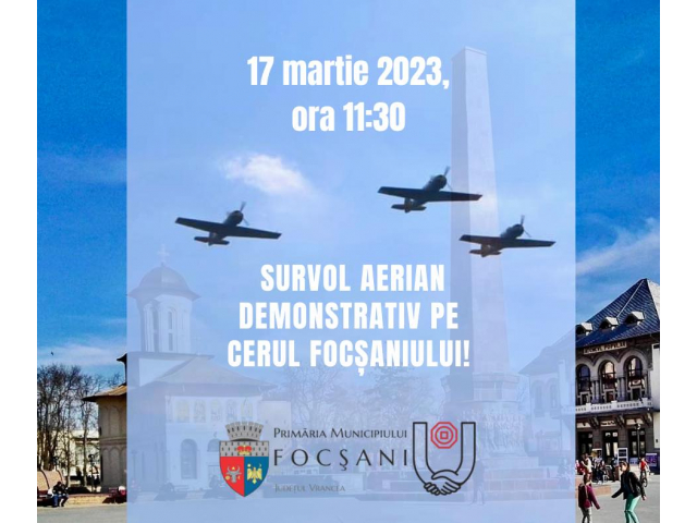 Mâine, 17 martie 2023, ora 11.30, o formațiune de avioane și elicoptere din dotarea Forțelor Aeriene Române va survola zona centrală din Municipiul Focșani!