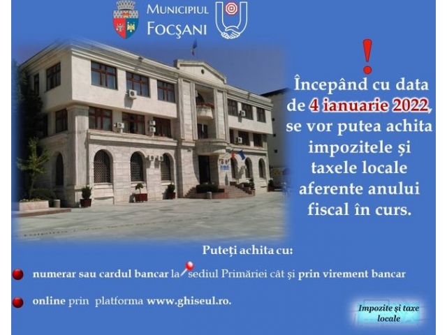 Primăria Municipiului Focşani aduce la cunoştinţa persoanelor fizice și juridice că, începând cu data de 4 ianuarie 2022, se vor putea achita impozitele și taxele locale aferente anului fiscal în curs. Acestea se pot achita cu numerar sau cardul bancar la sediul Primăriei Municipiului Focșani, cât și prin virament bancar și online prin platforma www.ghiseul.ro.