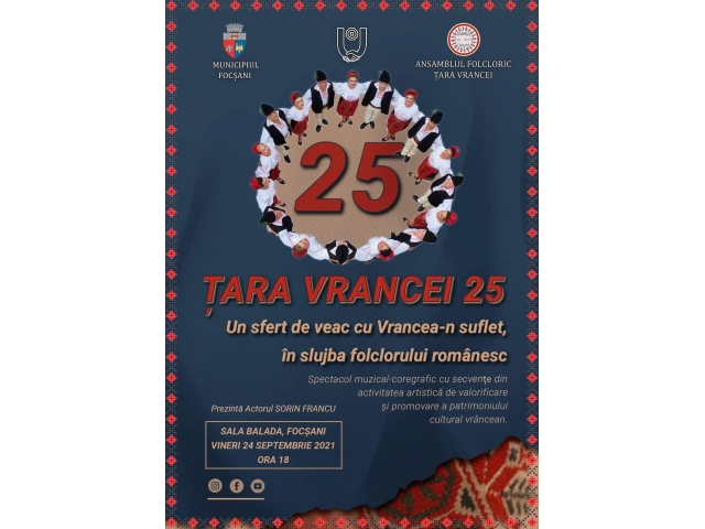 Iar la această sărbătoare, îi invităm pe toți iubitorii muzicii tradiționale, dansului popular și spiritului național românesc să fie alături de artiștii Ansamblului Folcloric „Țara Vrancei" pentru a marca așa cum se cuvine MUNCA lor de un SFERT DE SECOL.