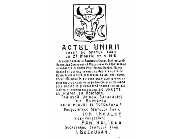Pe 27 martie 1918, Sfatul Ţării de la Chişinău, întrunit în şedinţă solemnă, a votat Unirea provinciei româneşti Basarabia cu România!