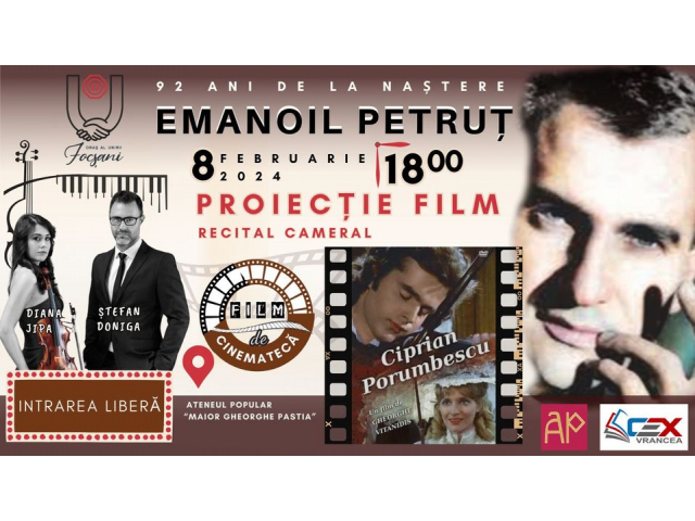 La evenimentul din această seară, care este dedicat actorului Emanoil Petruț, vom proiecta filmul "Ciprian Porumbescu", dar ne vom întâlni și cu artiștii Diana Jipa (vioară) și Ștefan Doniga (pian) care vor interpreta din opera compozitorului. Cu această ocazie vom afla și cum a ajuns filmul pe care îl vom urmări împreună să fie cel mai vizionat film românesc în lume