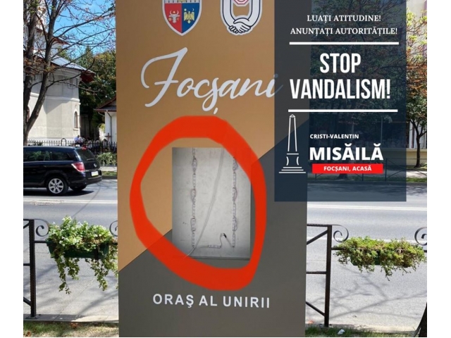 Zilele acestea a fost vandalizat un totem de pe B-dul Unirii din Focșani. Poliția a fost deja sesizată și, cu ajutorul camerelor din zonă, autorii vor fi identificați! Fac apel la toți cetățenii de bună credință să anunțe autoritățile atunci când văd că cineva distruge bunurile publice.