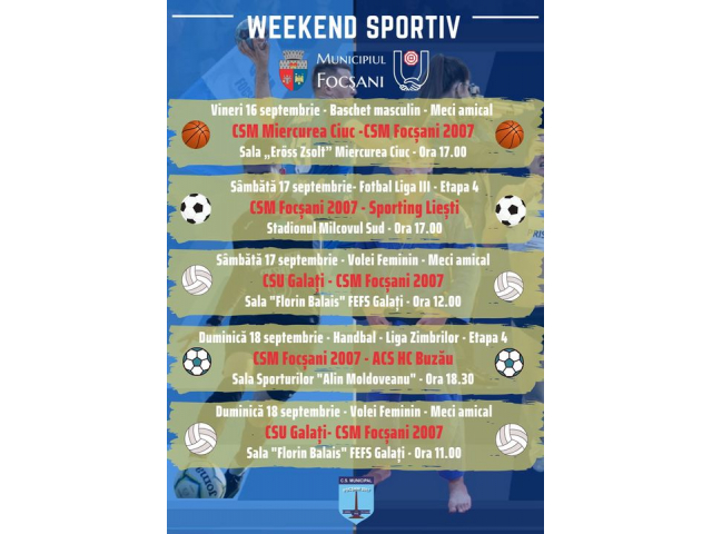 Weekend bogat în evenimente pentru pasionații de sport din Focșani. Echipele noastre angrenate în competițiile sportive vor evolua atât pe teren propriu cât și în deplasare.