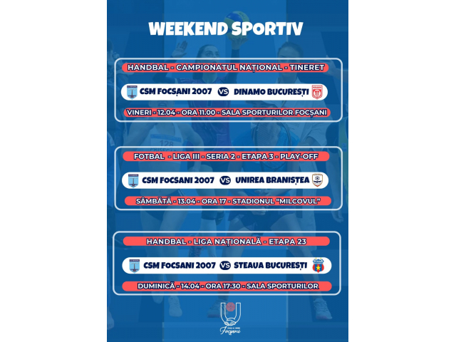 Duminică, de la ora 17.30, echipa de handbal seniori a CSM Focșani 2007 va juca pe teren propriu în compania formației CSA Steaua București. Meciul se va disputa în Sala Sporturilor "Alin Moldoveanu" și va fi transmis în direct pe Pro Arena.