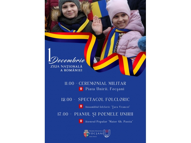 Primăria Municipiului Focșani organizează mai multe evenimente menite a sărbători 1 Decembrie, Ziua Națională a României.