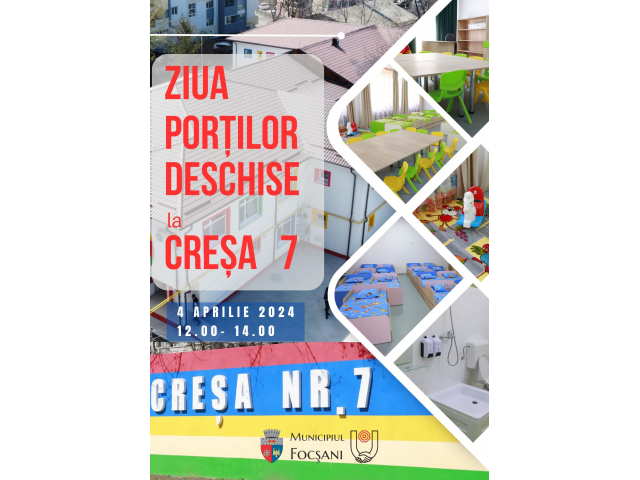 Primăria Municipiului Focșani îi invită pe toți părinții, bunicii și pe cei interesați la „Ziua Porților Deschise la Creșa nr. 7", un eveniment care va fi organizat joi, 4 aprilie 2024.
